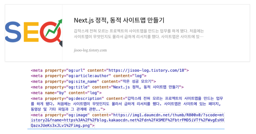 저 링크 글에 들어가서 검사(inspect)를 통해 element 탭에서 <head> 를 열어서 <meta> 를 찾아보자. 그러면 저 박스 내용이 전부 들어있다는 것을 알 수 있다.