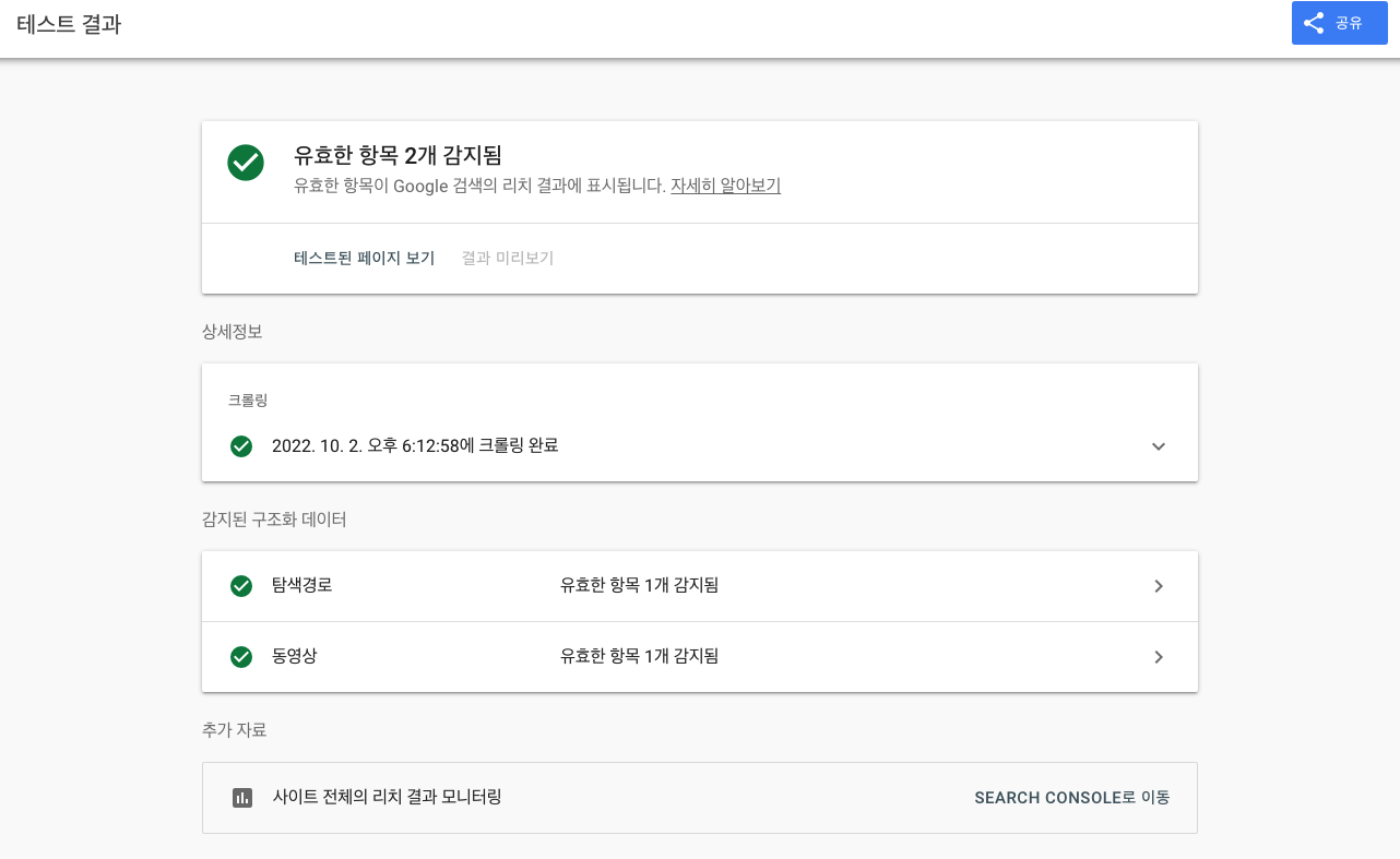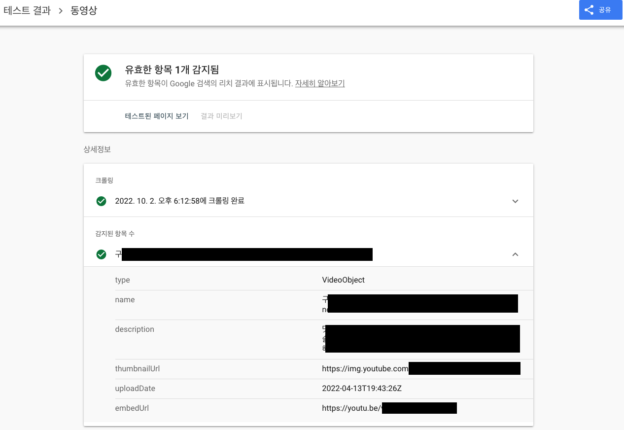 <Head> <script key="video-object" type="application/ld+json" dangerouslySetInnerHTML={{ __html: JSON.stringify( getVideoObjectScheme(initialVideo, description) ), }} /> </Head>export const getVideoObjectScheme = ( video, description ) => { return { '@context': 'https://schema.org', '@type': 'VideoObject', name: video.videoTitle, description: description, thumbnailUrl: `https://img.youtube.com/vi/${video.videoUrl.replace( /https:\/\/.*\//g, '' )}/mqdefault.jpg`, uploadDate: video.createdAt, embedUrl: video.videoUrl, }; };적용 결과