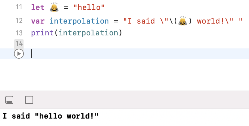 var month = 9 var date = 12 var day = "일요일" let today = "오늘은 \(month)월 \(date)일 \(day)입니다" print(today) // 오늘은 9월 12일 일요일입니다아래는 이모지로도 되나 재미로 한번 더 돌려봤다
